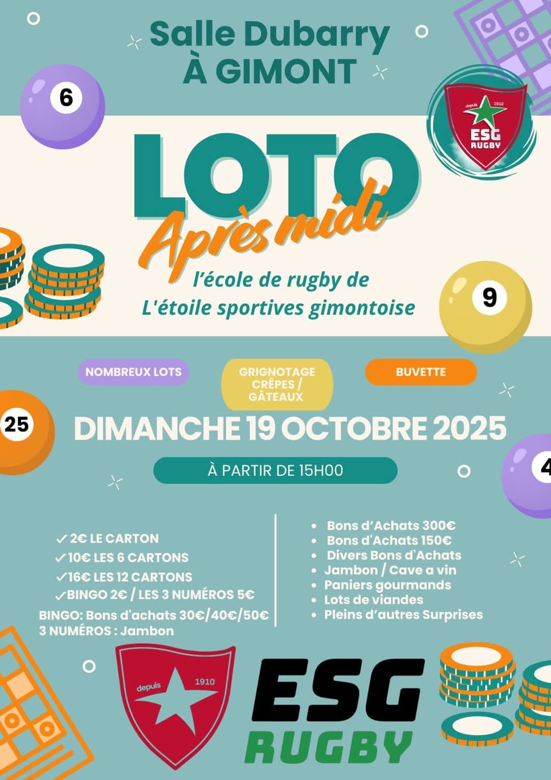 L'école de rugby de Gimont organise un loto le dimanche 19 octobre, à 15h. Rendez-vous à la Salle Dubarry. De nombreux lots sont à gagner comme des bons d'achats, des jambons, des lots de viande, des corbeilles gourmandes…