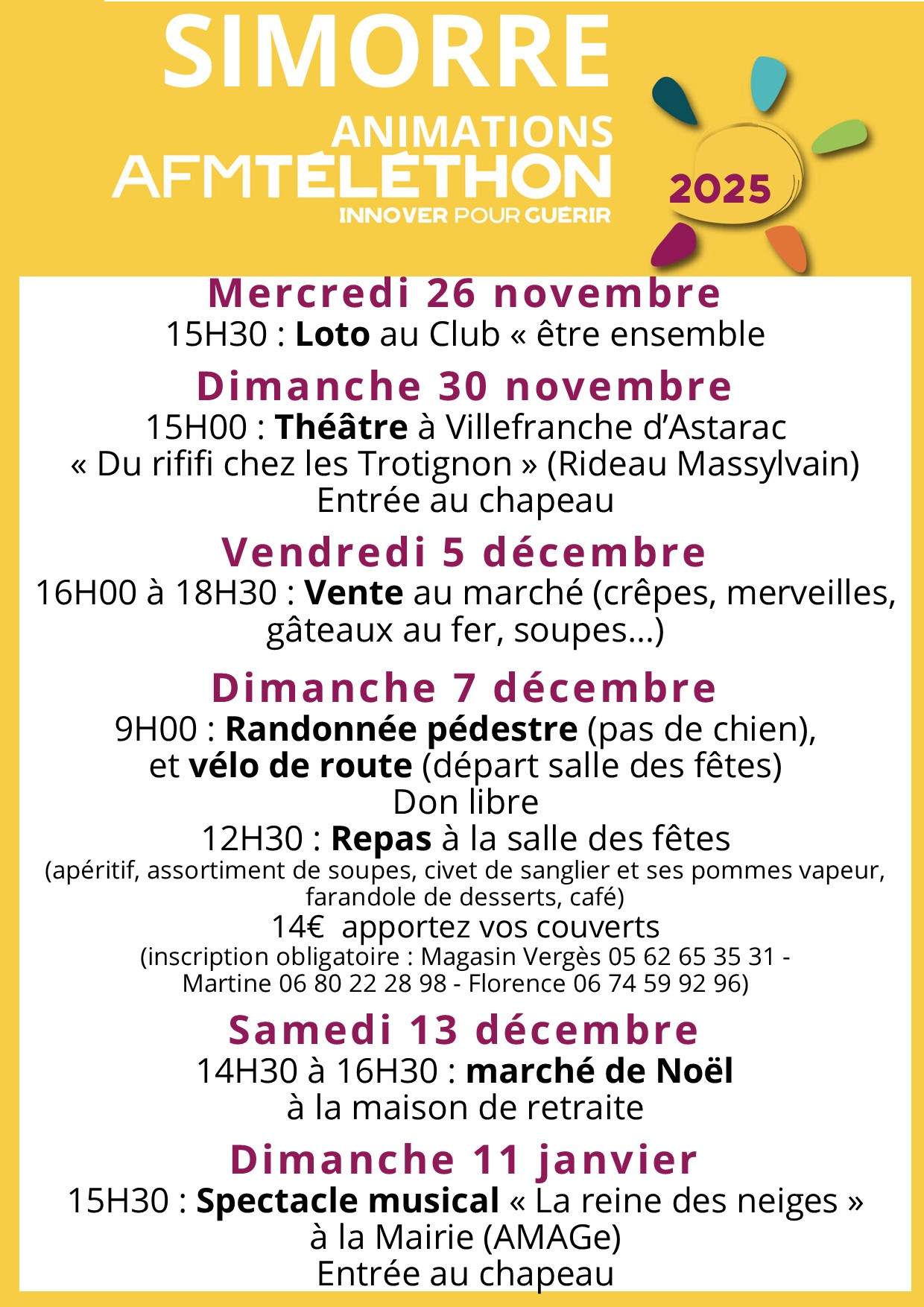 - Sunday, December 7: 9 am: hiking and road biking. Departure from the village hall. Free donation. 12h: meal in the village hall with on the menu: aperitif, assorted soups, boar stew and its steamed apples, farandole of desserts and coffee. Rate: 14€. Reservations required at 05 62 65 35 31 (store Vergès), 06 80 22 28 98 (Martine) or 06 74 59 92 96 (Florence).