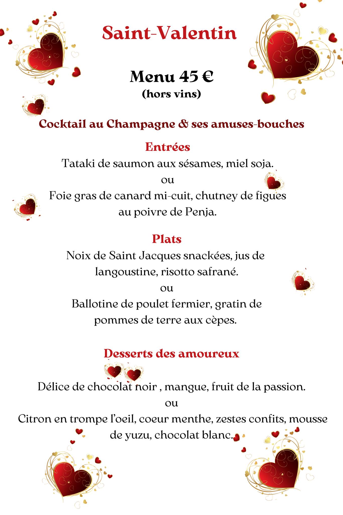 On the menu for €45 per person (excluding wines): champagne cocktail and its appetizers, starters: salmon tataki with sesame seeds and soy honey or semi-cooked foie gras, fig chutney with Penja pepper, dishes: snacked St Jacques nuts langoustine juice and saffron risotto or chicken ballotine farmer’s potato gratin with porcini mushrooms, lovers' desserts: dark chocolate delight, mango, passion fruit or trompe-l'oeil lemon, mint heart, candied zests, white chocolate yuzu mousse.