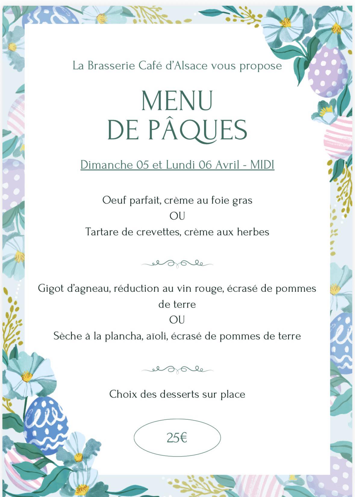 An Easter menu is offered by the Brasserie Café d'Alsace on Sunday 5th and Monday 6th April, at noon.