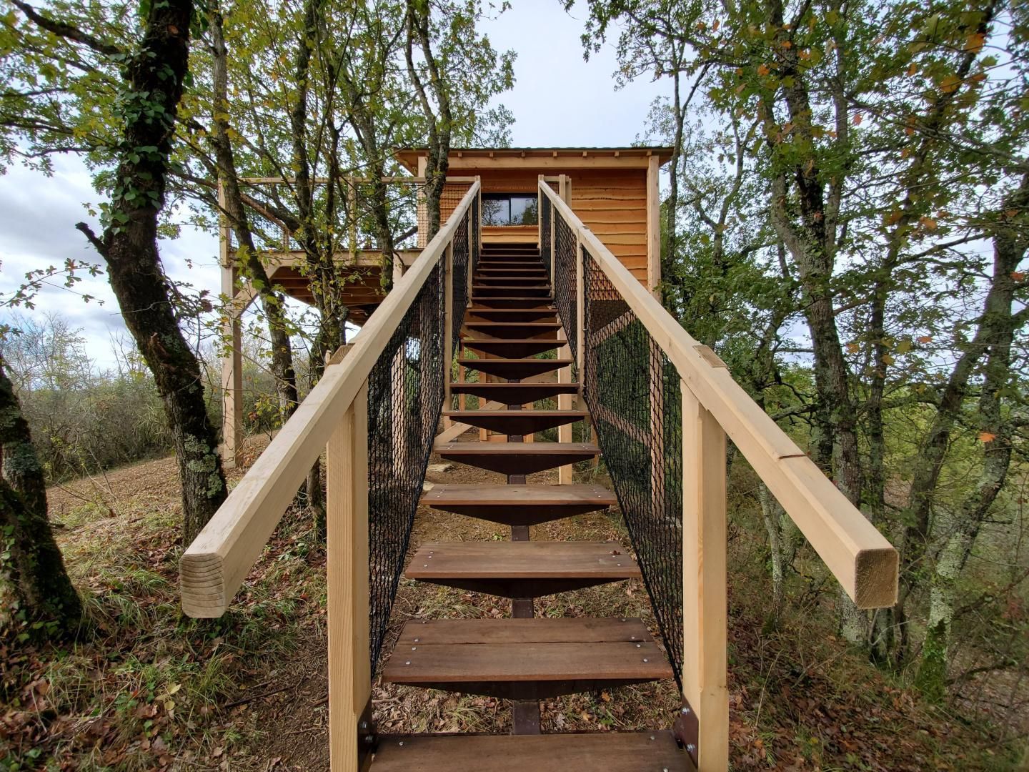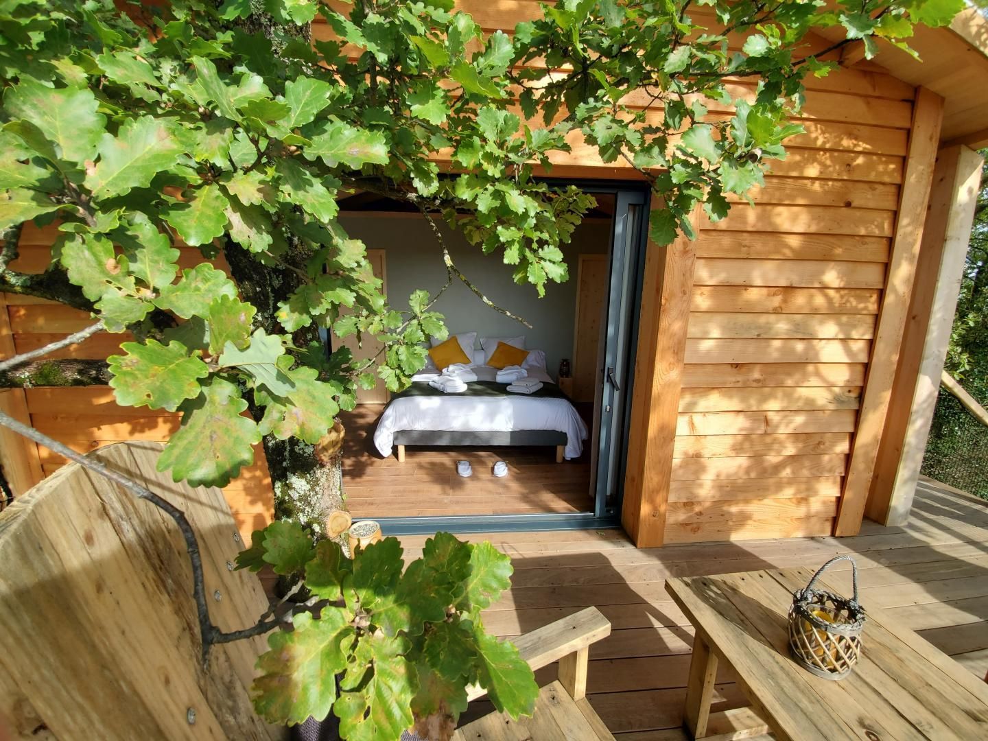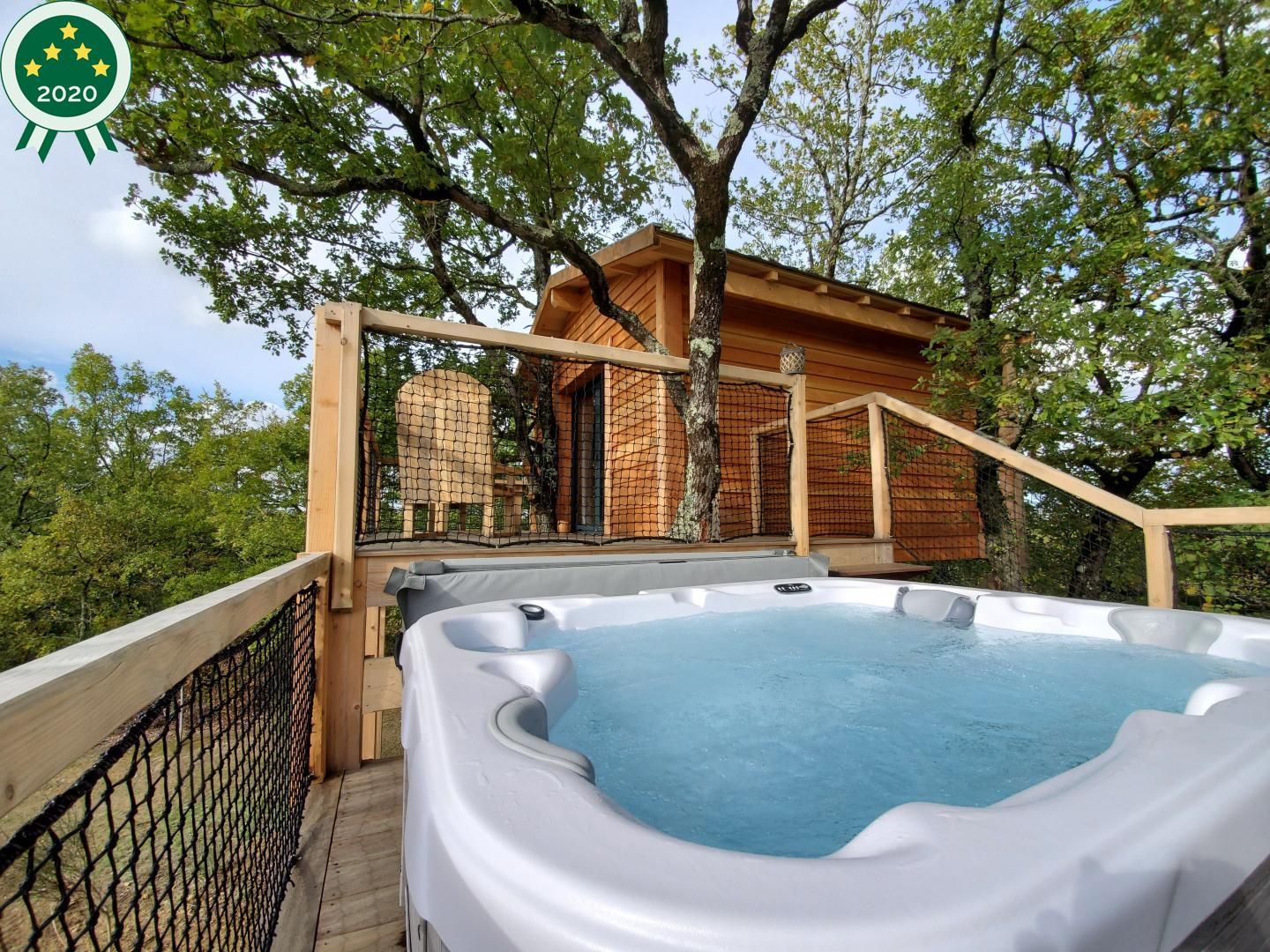 Perched in the trees of a Natura 2000 site, the "Orchis Spa" and "Ophrys Bulles" tree houses invite you to unwind in the heart of nature. Leave your car in the parking lot, enjoy a stroll through the meadow to reach the tree houses, and discover the breathtaking views of the Pyrenees mountains, the Gascon landscape, and the surrounding countryside. Each tree house has been perfectly integrated into the trees to minimize its impact. In an eco-friendly approach, lighting is provided by solar lanterns, and wastewater is treated using a phytoremediation system.