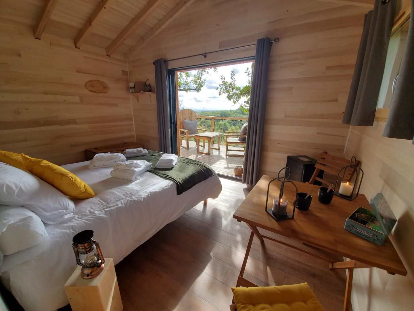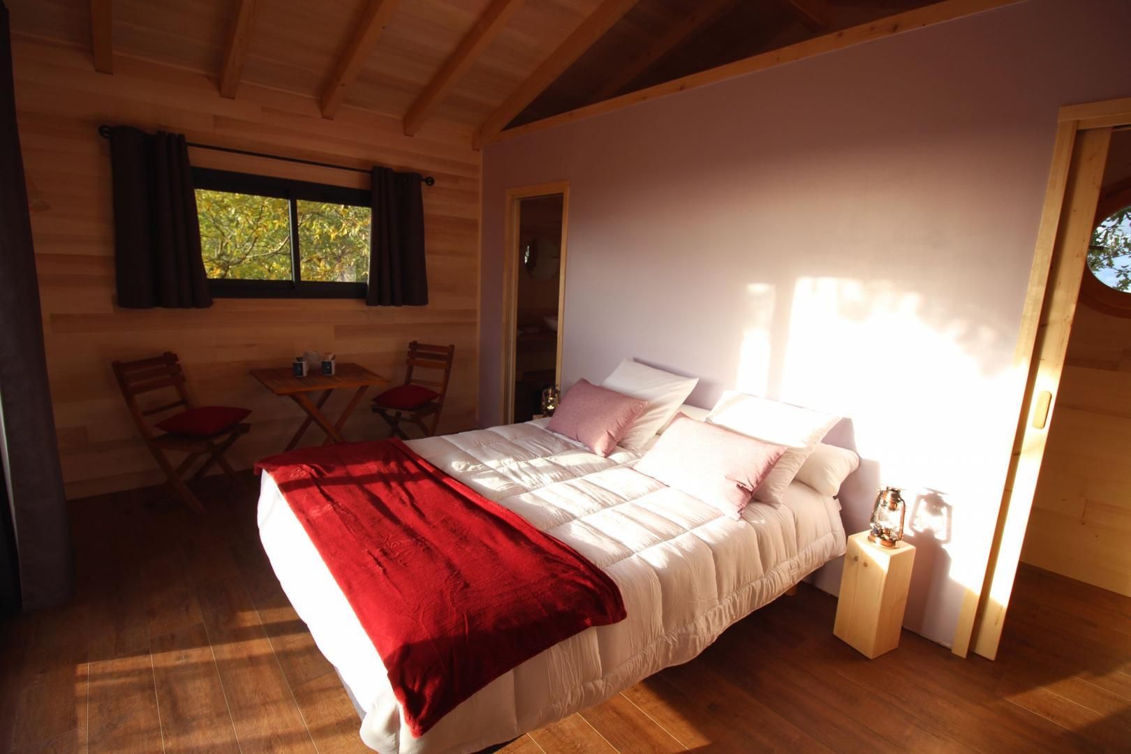 Each accommodation features a beautiful south-facing terrace, a queen-size bed with a direct view of the landscape through a picture window. For your comfort, a shower room and a separate toilet are at your disposal. The Orchis Spa cabin also offers a spa for ultimate relaxation. A delicious breakfast will be delivered to your terrace in a basket. The Ophrys Bulles cabin features a Nordic bath. To help you make the most of your stay, we offer gourmet baskets for two people: the "Aperitif Basket," the "Luxury Aperitif Basket," the "Tasting Basket," and the "Musketeer Basket," available by reservation. Ophrys Bulles cabin only: extra bed for a child €35.