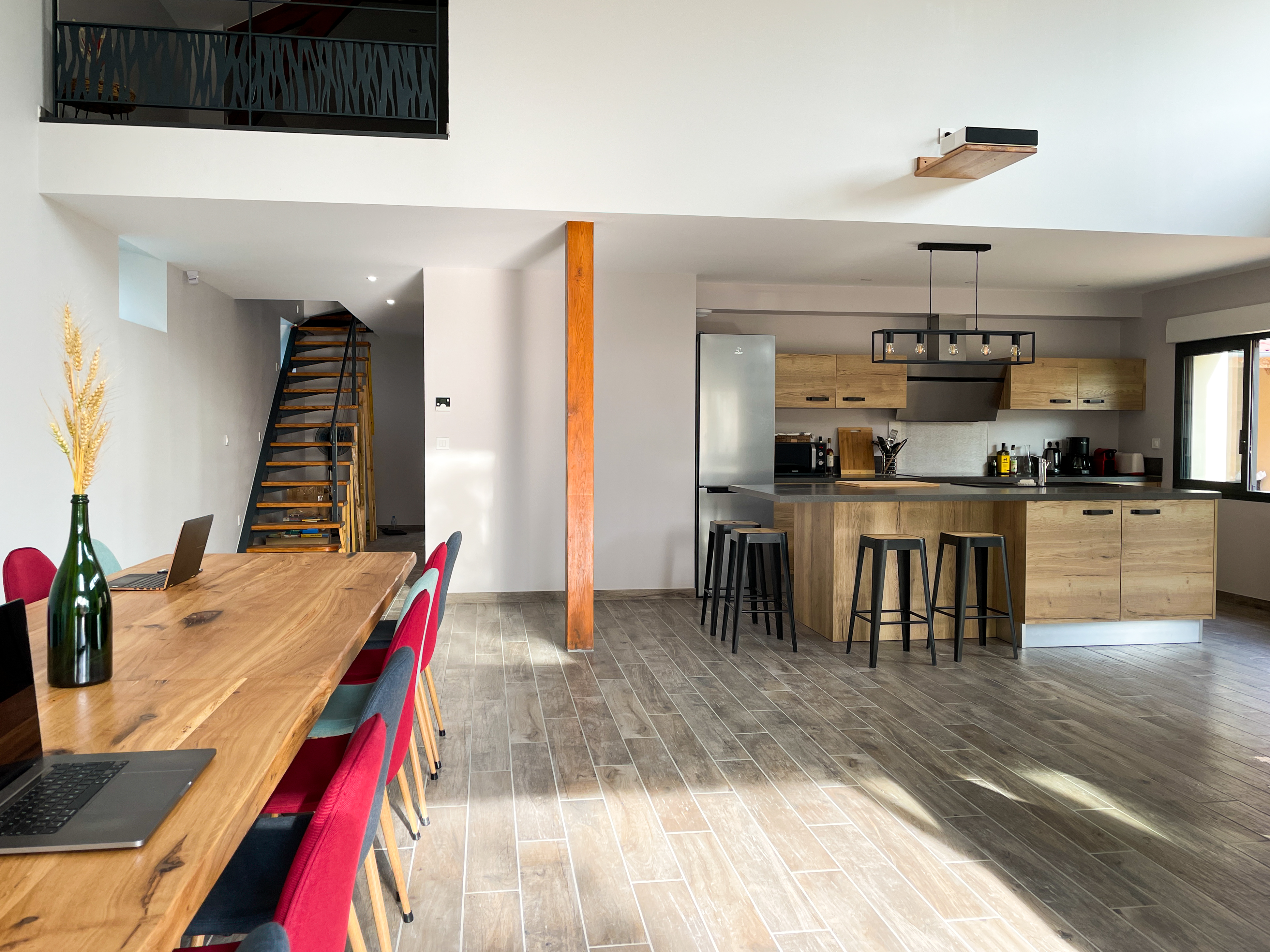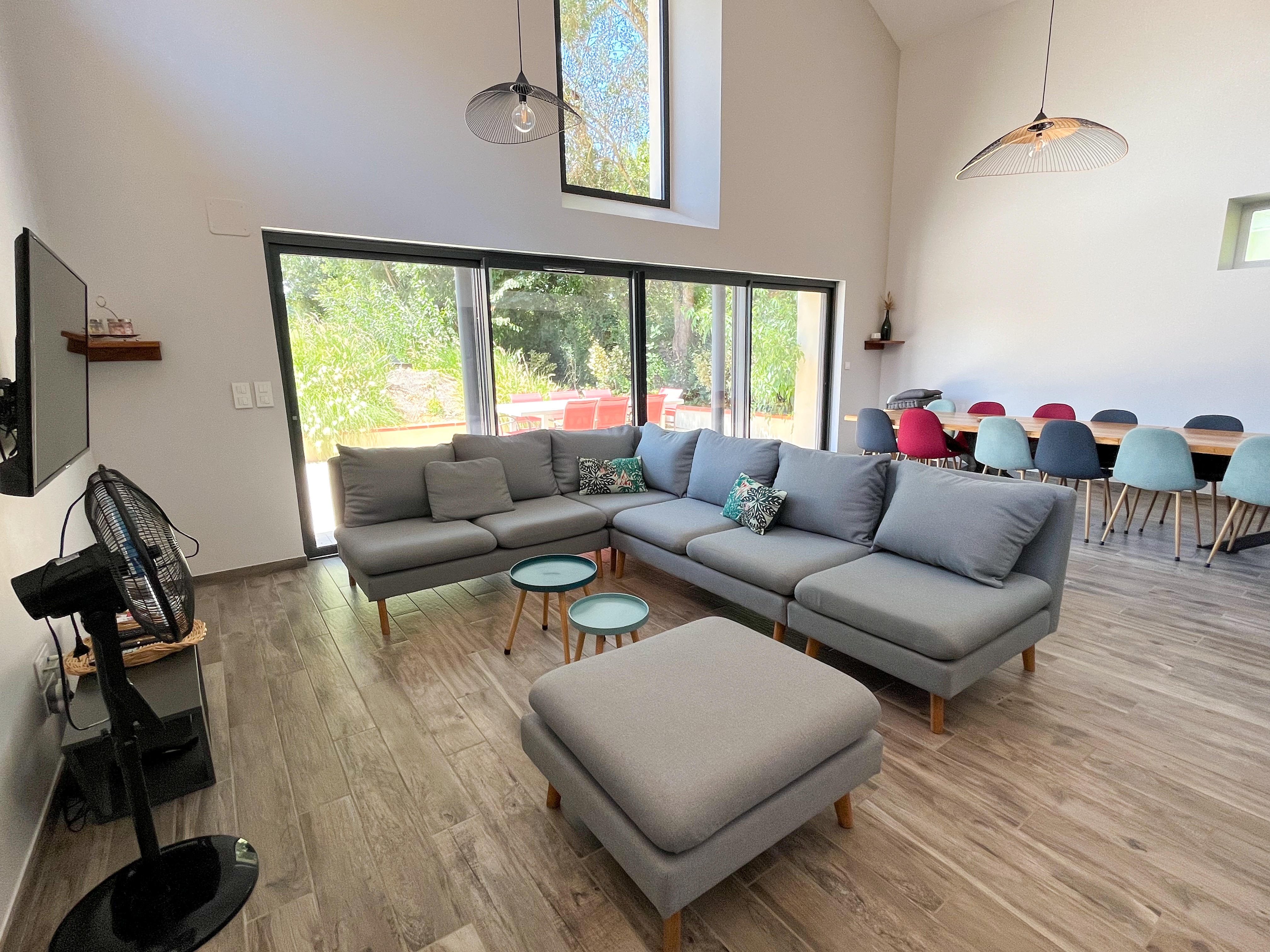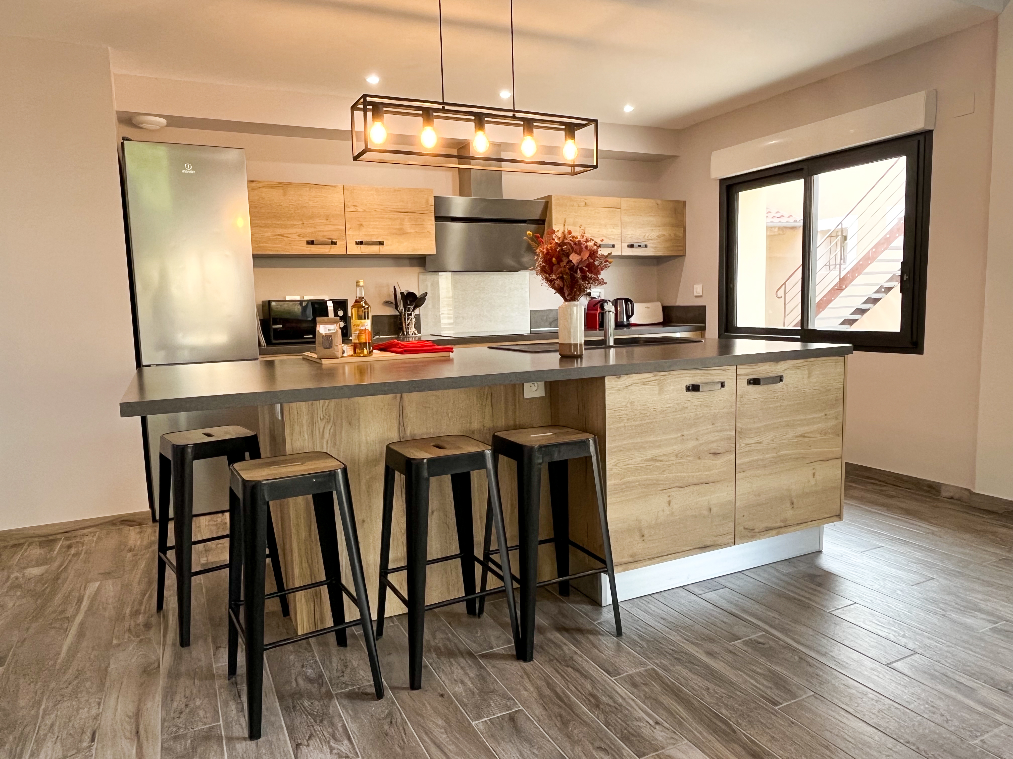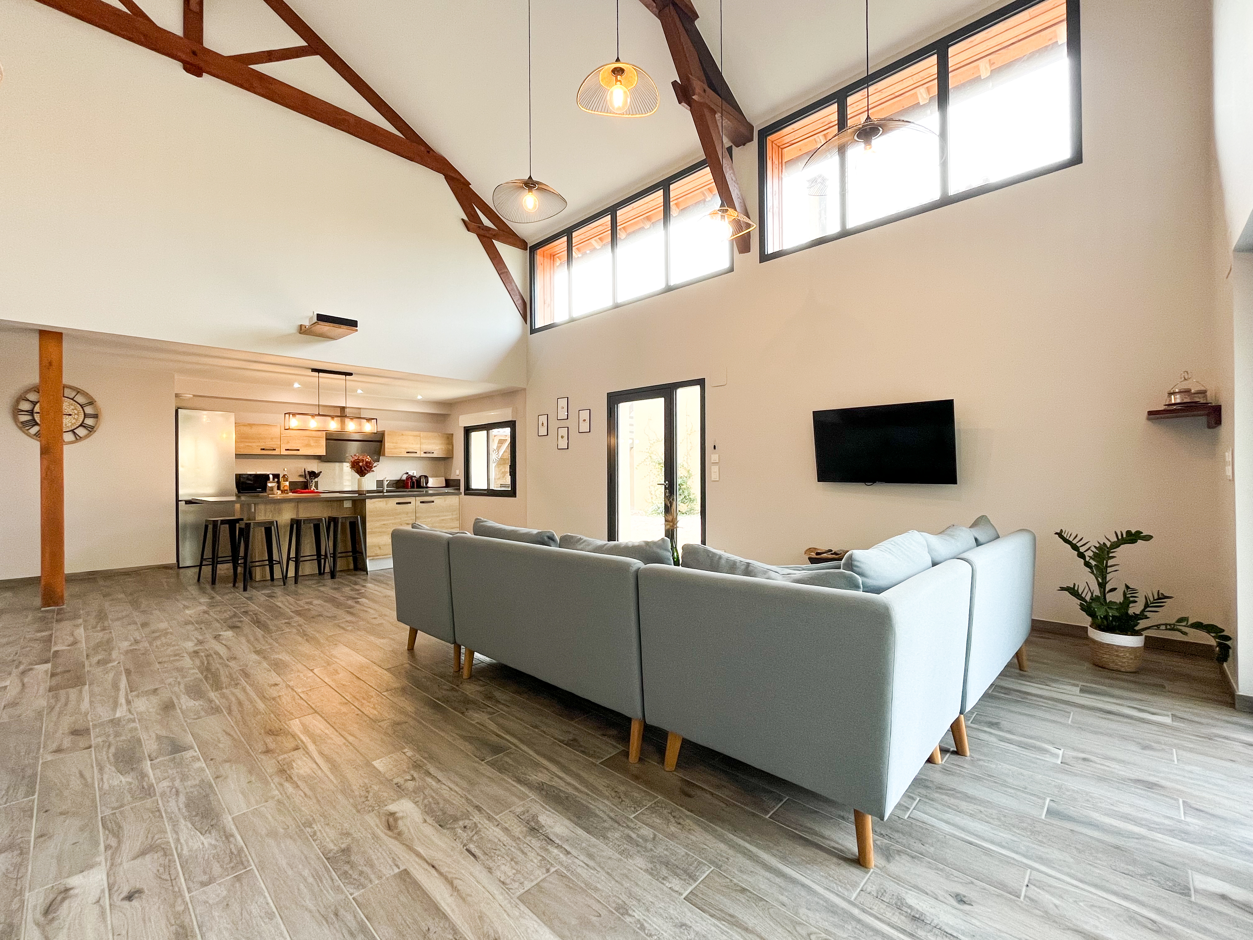 Au rez-de-chaussée du bâtiment principal se trouve également la pièce à vivre de 80m2 avec plafond cathédral, composée d’une cuisine intégrée et super équipée, d’un espace salle à manger, d’un salon avec canapé, TV et vidéoprojecteur wifi. Elle offre un accès direct à la terrasse extérieure avec l’espace repas ombragé faisant face à la piscine. Une buanderie avec lave linge, frigo et évier, ainsi qu’un wc indépendant au rdch complètent l’ensemble.