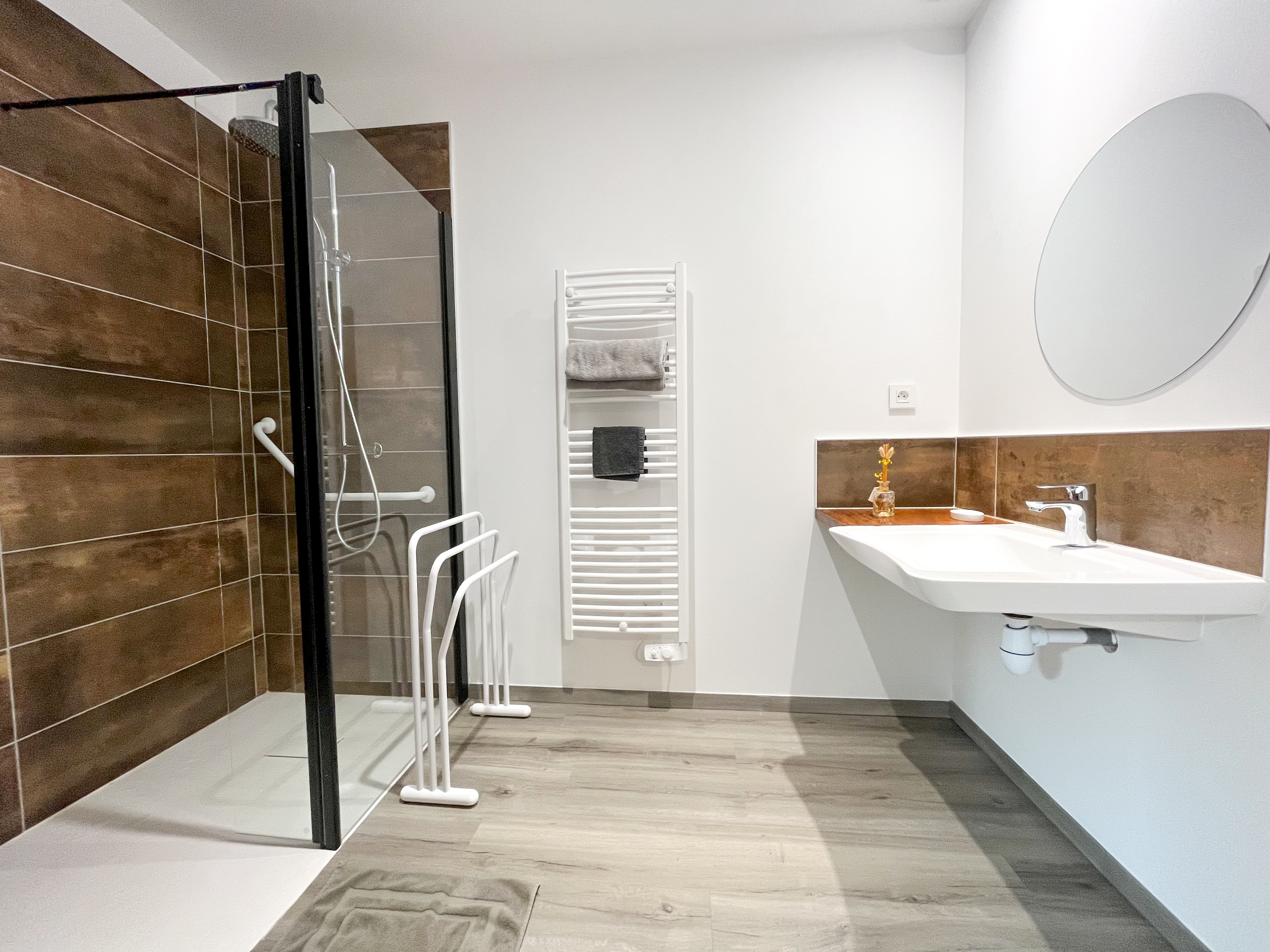 -Chambre Colorado plein pied - porte de + de 81 cm (2 pers), 27 m2, 2 lits TWIN (90 ou 180). Salle de bain privée avec douche italienne et wc séparé adapté.