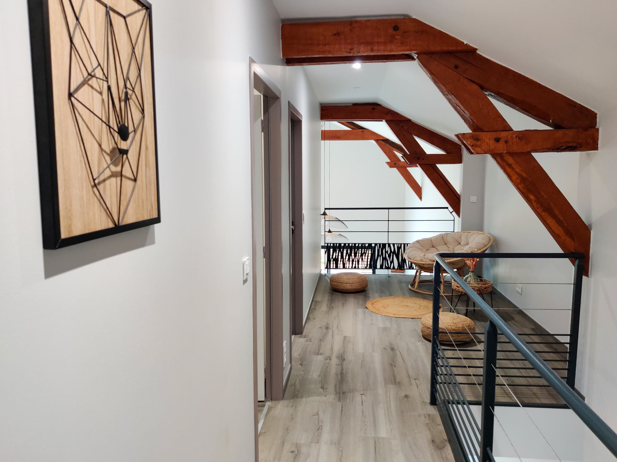 Le bâtiment principal est une ancienne étable entièrement rénovée comportant 3 chambres avec salles de bain privées avec WC, dont une chambre spacieuse de 27m2 au rez-de-chaussée et 2 chambres de 23m2 à l’étage. 3 autres chambres supplémentaires se trouvent à l’étage de l’annexe - le bâtiment secondaire -, accessible par un escalier extérieur. Elles partagent une salle de bain avec WC séparé.