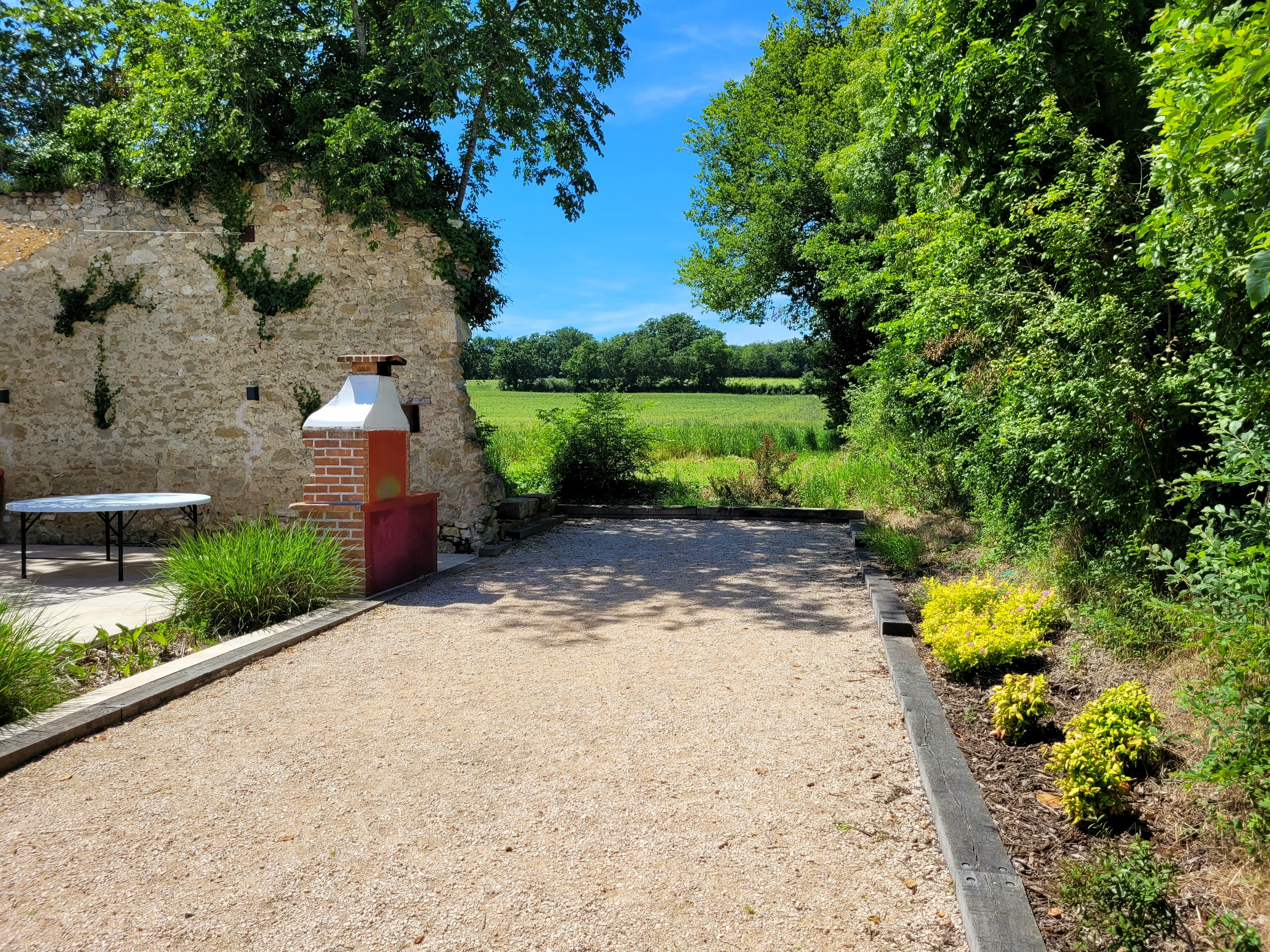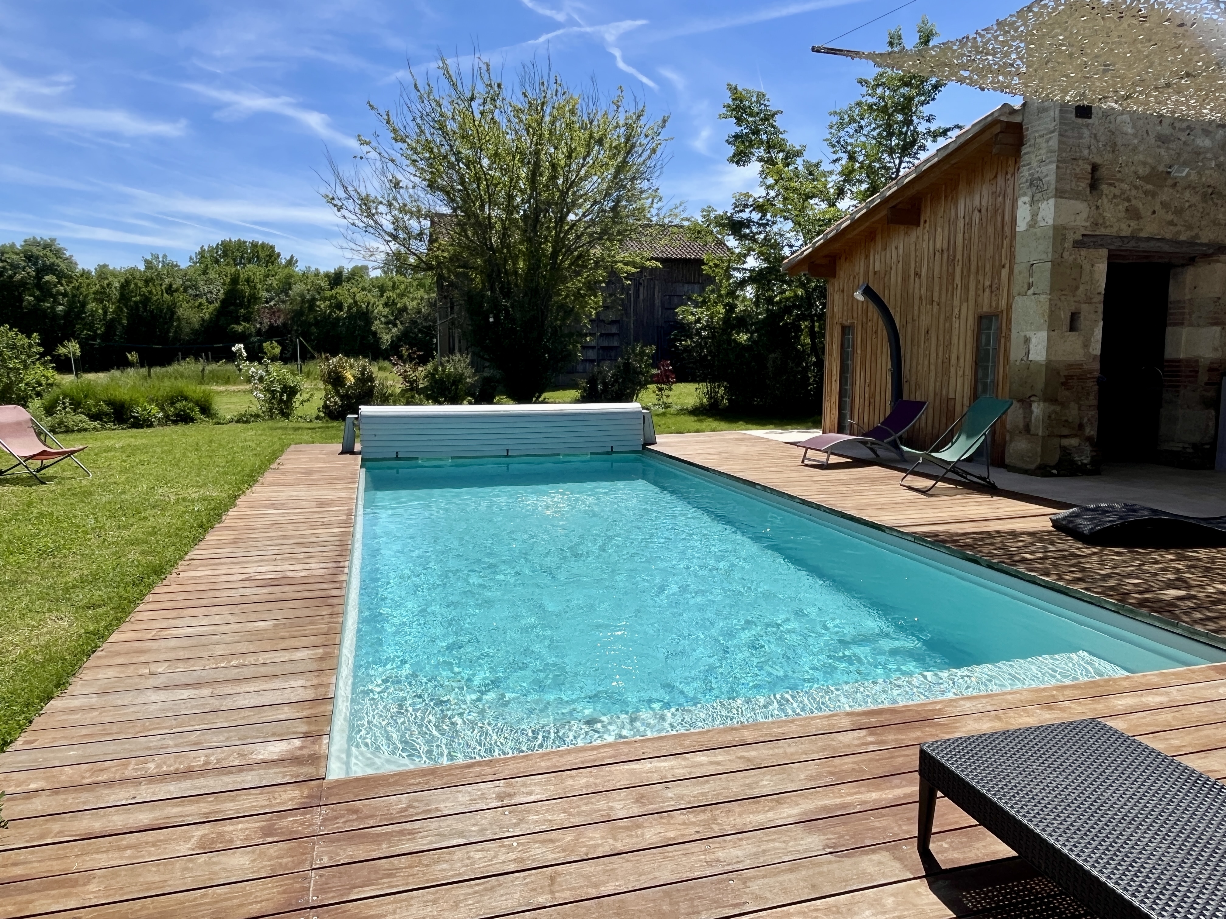Pour la convivialité, une piscine privée de 9mx4m x 1,5m de profondeur avec une large plage immergée, un escalier d’angle et un volet roulant antichute est à disposition. Elle peut être chauffée dés son ouverture en avril, sans surcoût et permet d'augmenter le température de l'eau de 10° au dessus de celle de l'air. Il y a aussi une grande terrasse avec chaises longues, transats, cuisine d’été, barbecue à bois (charbon non fourni) et WC extérieur, terrain de pétanque de 15mx4m, aire de jeux pour enfants avec toboggan végétalisé, balançoire et cabane « vivante » en saule. Une table de ping-pong et divers autres jeux sont également disponibles comme divertissement. A noter que le terrain est non clos, et des voisins se trouvent à une dizaine de mètres, il faudra donc les respecter en limitant les nuisances. Il n'y a cependant aucun vis à vis avec personne !